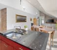 • modern kitchen, red cabinets, white counter, island, oven, fireplace