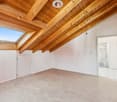 • modern attic room, white walls, tiled floor, wooden railing, large skylight