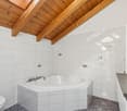 • Modern bathroom with shower, toilet, and bathtub. White tiles and fixtures.