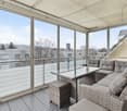 • Outdoor balcony, covered with glass, table and chairs, tiled floor, city view