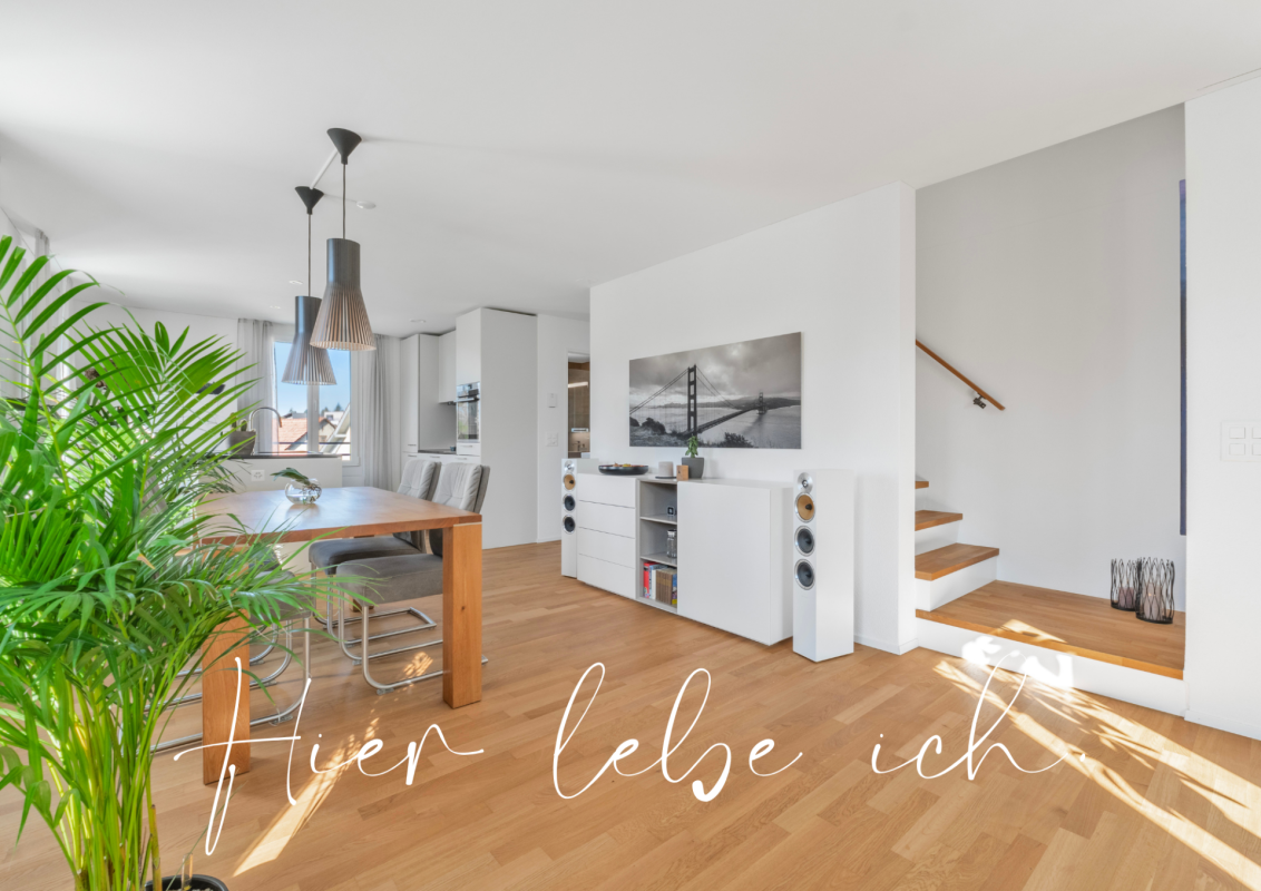 Diese elegante Maisonettewohnung mit 160 m² Wohnfläche überzeugt durch modernes Design und eine durchdachte Raumaufteilung. Der lichtdurchflutete Wohn- und Essbereich mit grossen Fensterfronten führt direkt in die hochwertige Designküche mit Kochinsel, Bora-Dampfabzug, Backofen und Steamer – ideal für kulinarische Genussmomente.Auf der oberen Ebene befinden sich zudem ein Schlafzimmer sowie ein modernes Badezimmer mit Dusche. Die sonnige Terrasse verbindet beide Etagen und leitet harmonisch zum privaten Gartenanteil mit Abendsonne über. Im Erdgeschoss erwarten Sie ein weiteres Schlafzimmer mit praktischen Einbauschränken sowie ein stilvolles Bad mit Badewanne.Zwei Tiefgaragenplätze mit moderner E-Ladestation, ein V-Zug Wäscheturm, ein grosszügiges Kellerabteil sowie der komfortable Liftzugang direkt auf das Wohnstockwerk sorgen für höchsten Komfort. Die ruhige Lage in Kombination mit Dorfladen und Bushaltestelle in Gehdistanz rundet dieses exklusive Angebot ab.Ihre Vorteile auf einen Blick:· Ruhige, idyllische Lage· V-Zug Adora Wäscheturm· Hochwertige, stilvolle Materialien· Privater Gartenanteil mit Abendsonne· 2 Tiefgaragenparkplätze mit E-Ladestation (zzgl. je CHF 55'000.-)· Dorfladen und Bushaltestelle in Gehdistanz· Moderne Bäder mit Dusche und Badewanne· Designküche mit Backofen, Steamer und Bora-DampfabzugHaben wir Ihr Interesse geweckt? Fordern Sie jetzt die umfassende Verkaufsdokumentation mit virtuellem 560°-Rundgang an – wir freuen uns darauf, Ihnen diese besondere Wohnung persönlich zu präsentieren.