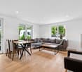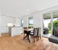 • Spacious dining area with large windows, wooden dining table, black leather chairs, decorative plants, and artwork on the walls. The room has a modern and open design with access to a balcony or terrace.