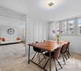 • Dining area, wooden table, modern chairs, kitchen, balcony