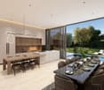 • Modern two-story house with large glass windows and sliding doors leading to a patio or terrace area. The house has a flat roof and a stone exterior. The interior is visible through the glass walls, showing a living room and dining area.