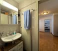 • Bathroom: skylight, vanity with two sinks, mirror, hanging green towel, toilet, under-sink cabinet
