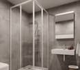 • Bright and modern bathroom with a glass shower enclosure, white tiles, a sink with a vanity, and a window providing natural light.