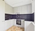 • Open floor plan with kitchen and living area, modern cabinets, built-in oven and microwave, sleek lighting.