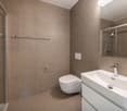 • Modern, clean and minimalistic bathroom with white tiles, toilet, sink, and a small shelf