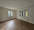 • Spacious open-plan living area with large windows, hardwood flooring, and a dining table. The room features a minimalist design with white walls and modern furniture. A balcony or terrace is visible through the windows, providing natural light and a poten