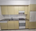 • Modern kitchen with white cabinets, wooden countertop, and a dishwasher visible.