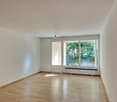 • Wooden walls, wooden floor, large window with view to outside, white radiator, empty room