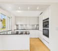 • modern open kitchen with stove, oven, sink and wooden cabinets, gray staircase, minimalist style