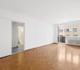 • large windows, sliding glass door to balcony, hardwood floors, white walls
