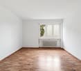 • Empty room with white walls, wooden floor, large glass window facing outside
