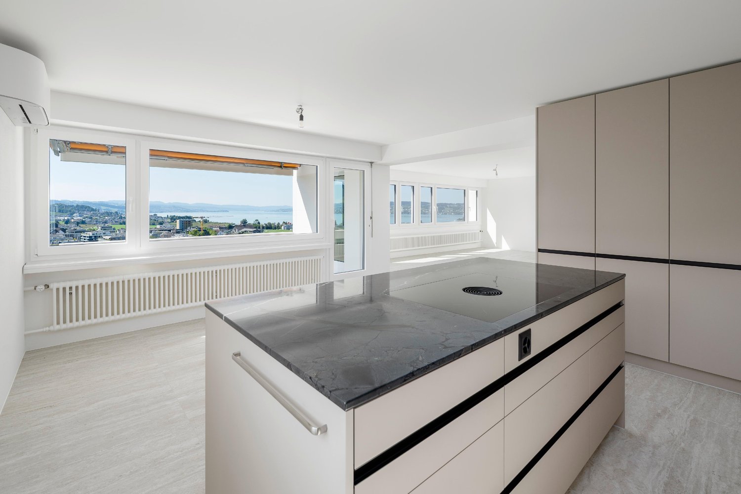 Hinweis: Die Wohnung könnte bereits per 01.11.2028 übernommen werden. Diese exquisit gestaltete Attikawohnung bietet ein grosszügiges Raumkonzept mit hellen, einladenden Zimmern, die einen luxuriösen Lebensstil unterstreichen. Freuen Sie sich auf insgesamt fünf Terrassen und einen atemberaubenden Blick auf den malerischen Zürichsee. Der Wohnbereich, mit Zugang zu zwei offenen Terrassen und einem grossflächigen verglasten Balkon, der auch an kälteren und windigen Tagen nutzbar ist, verfügt über ein stilvolles Cheminée. Ein Feuer mit Seeblick verspricht pure Entspannung und lässt Sie Ihren wohlverdienten Feierabend in vollen Zügen geniessen.Die beiden eleganten Wohlfühlbäder mit separaten Duschen und jeweils einem Closomat bieten höchsten Komfort und einfache Bedienung aller Einrichtungen.Highlights der Wohnung: • Lift bis in die Wohnung • Grosszügige, lichtdurchflutete Räume • Luxuriöse Küche mit Food-Center, Induktionsherd, Steamer und 2 Lavabos, etc. • 2 stilvolle Badezimmer • 1 Gästebad • Eigene Waschmaschine und Tumbler im separaten Waschraum • Zahlreiche vollintegrierte Wandschränke • 8 Terrassen, davon 2 vollverglast und überdacht • Dusche auf einer der Terrassen • Panoramablick auf den See • Hochwertiger und exklusiver Ausbau • Private Garage mit 82 m2 zur alleinigen Benutzung Bei Fragen oder für eine Besichtigung stehen wir Ihnen gerne zur Verfügung und freuen uns auf Ihre Kontaktaufnahme.