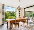 • dining room with a large table, modern chairs, kitchen with appliances, windows with a view of the street