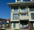 • Modern multi-story apartment building with balconies, surrounded by a landscaped yard with gravel and vegetation