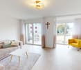 • Spacious apartment with a large balcony overlooking a wooded area. The balcony has a table and chairs, providing an outdoor living space. The interior features large windows, hardwood floors, and modern furnishings including a sofa and entertainment unit.