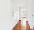 • white tiled hallway, wooden cabinet, mirror, carpet
