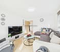 • Spacious open-plan living area with large windows offering a scenic view, modern kitchen with black countertops, dining table, and comfortable living room furniture