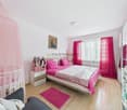• The image shows a bedroom with a minimalist design. The room has white walls and a dark wood-like floor. There is a built-in wardrobe along one wall, providing ample storage space. The room is well-lit, with a ceiling light fixture visible. Overall, the s