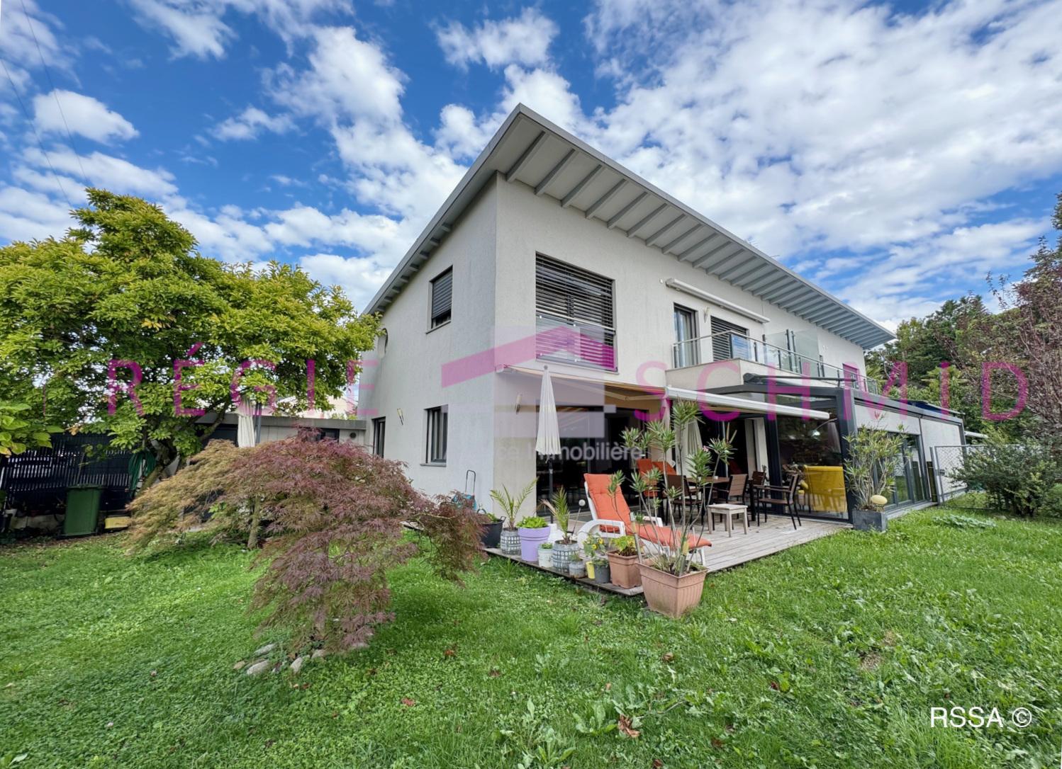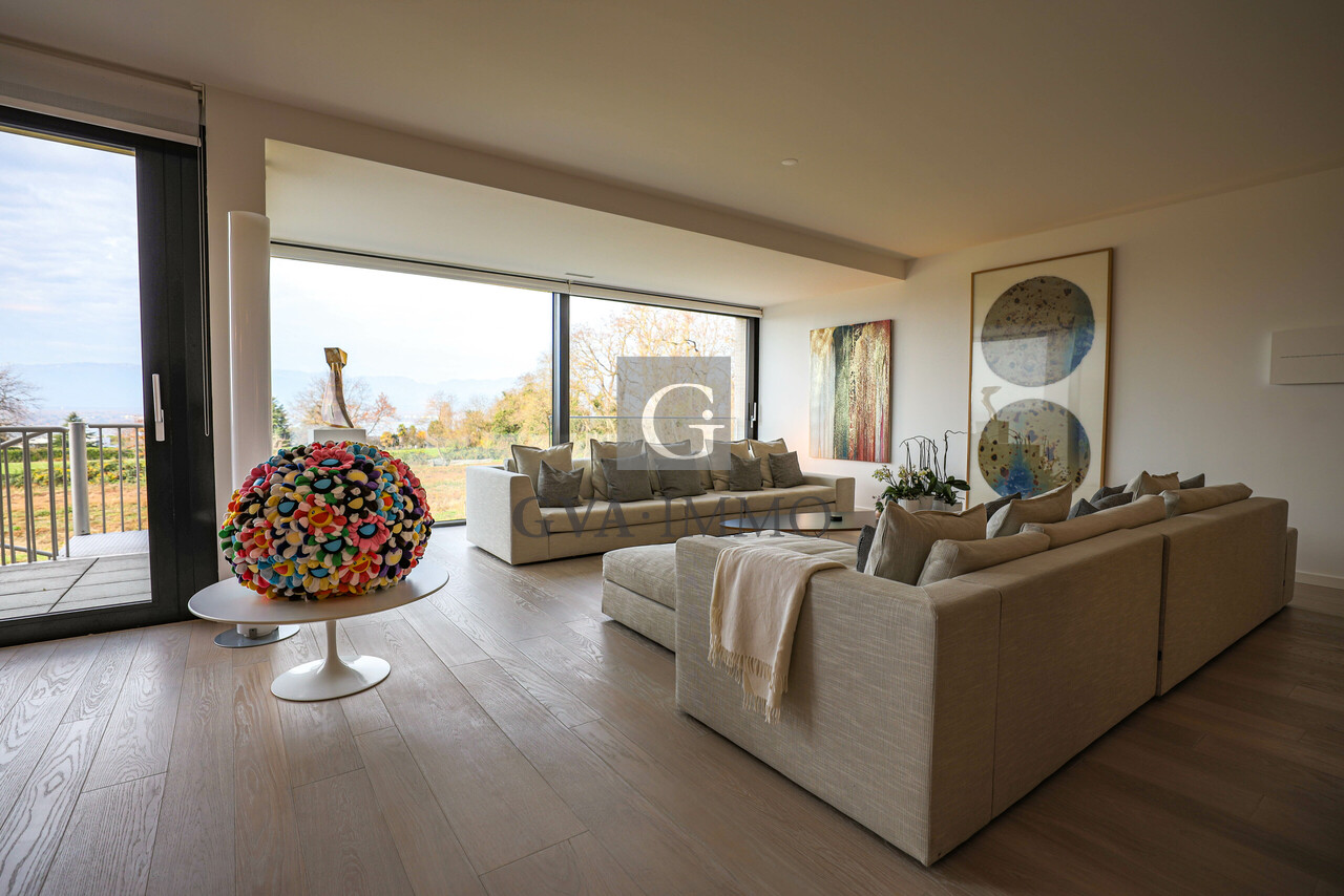 Somptueux attique en duplex aux volumes rares, offrant un cadre de vie d'exception. Situé à Corsier, sur la rive gauche de Genève, dans un environnement calme et verdoyant, il bénéficie d'une vue panoramique spectaculaire sur la campagne et le lac. À quelques pas du village de Corsier et de ses commodités locales, cet appartement bénéficie d'un emplacement privilégié.Construit en 2013, dans une résidence de standing respectueuse des normes écologiques et certifié Minergie, il combine une performance énergétique optimale et un confort de vie moderne.Réparti sur 380 m², l'appartement est baigné de lumière grâce à ses grandes baies vitrées et à un puits de lumière traversant du haut en bas, qui inonde l'ensemble des espaces d'une clarté naturelle et confère à l'ensemble une atmosphère lumineuse et accueillante.À l'étage supérieur, une grande cuisine ouverte avec îlot central équipée d'appareils Gaggenau ravira les amateurs de gastronomie. Cet espace s'ouvre sur une salle à manger spacieuse, idéale pour recevoir famille et amis. Deux chambres à coucher avec balcons, deux salles de bains, ainsi qu'un toilette visiteurs complètent cet étage. Une magnifique terrasse spacieuse de 42 m² offre un cadre idéal pour se détendre en plein air et profiter pleinement de la vue panoramique.Un superbe escalier mène à l'étage inférieur, où se trouve un vaste salon avec une cuisine d'appoint et balcon, baigné de lumière naturelle grâce à de généreuses baies vitrées. Ce niveau comprend également une suite parentale composée de deux chambres avec balcons, dont l'une peut être aménagée en un spacieux dressing. Une grande salle de bains, un WC séparé, une buanderie et un toilette visiteurs viennent compléter cet étage, alliant praticité et confort.Ce duplex exclusif, associe confort moderne, optimisation de la lumière et vue à couper le souffle. Il offre un cadre de vie unique, alliant modernité et raffinement au coeur d'un environnement naturel privilégié.Sumptuous duplex penthouse with rare volumes, offering an exceptional living environment. Located in Corsier, on the left bank of Geneva, in a quiet and green setting, it boasts spectacular panoramic views of the countryside and the lake. Just a few steps from the village of Corsier and its local amenities, this apartment enjoys a privileged location.Built in 2013, in a luxury residence that complies with ecological standards and is Minergie-certified, it combines optimum energy performance with modern living comfort.Spread over 380 sqm, the apartment is bathed in light thanks to its large bay windows and a top-to-bottom skylight, which floods all the spaces with natural light and lends the whole a bright, welcoming atmosphere.On the upper floor, a large open kitchen with central island and Gaggenau appliances will delight food lovers. This space opens onto a spacious dining room, ideal for entertaining family and friends. Two bedrooms with balconies, two bathrooms and a guest lavatory complete this floor. A magnificent, spacious 42 sqm terrace provides the ideal setting for relaxing in the open air and taking full advantage of the panoramic view.A superb staircase leads down to the lower floor, where you'll find a vast living room with an additional kitchen and a balcony, bathed in natural light thanks to generous bay windows. This level also includes the master suite comprising two bedrooms with balconies, one of which can be converted into a spacious dressing room. A large bathroom, separate toilet, laundry room and guest lavatory complete this floor, combining practicality and comfort.This exclusive duplex combines modern comfort, optimized light and breathtaking views. It offers a unique living environment, combining modernity and refinement in the heart of a privileged natural setting