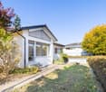 • Two-story building with a glass-enclosed patio, surrounded by lush greenery and a well-manicured lawn. The building features a chimney, suggesting the presence of a fireplace. There is an outdoor seating area with a table and chairs on a stone patio, over