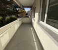• Spacious living room with large windows, gray sofa, desk with computer, and artwork on the wall. The room has a modern and minimalist design with tile flooring and access to a balcony or terrace.