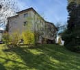 • Two-story farmhouse with a red tile roof, surrounded by lush green trees and a large grassy lawn. The property also includes a smaller wooden barn-like structure. The houses have white walls and windows, and there appears to be a balcony or terrace on one