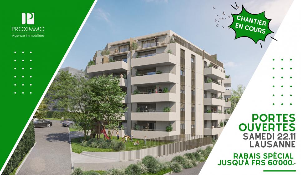 RABAIS EXCEPTIONNEL ALLANT JUSQU'À FRS. 60'000.--ACCÈS À L'IMMEUBLE AINSI QU'AUX LOGEMENTSCHANTIER EN COURS, DERNIÈRE CHANCE POUR CHOISIR VOS FINITIONS !Parfaitement situé dans un quartier résidentiel verdoyant et calme à proximité directe du centre de Lausanne, ce superbe projet immobilier de 59 appartements neufs de qualité, résolument contemporains vendus sur plan, bénéficie d'un cadre de vie exceptionnel pour la région au calme, à proximité directe de toutes les commodités et du centre-ville de Lausanne !Répondant à des critères de qualité, de sécurité et de confort des plus exigeants, cette superbe réalisation offre tous les atouts recherchés par des futurs propriétaires soucieux de bénéficier d'un environnement privilégié tout en jouissant des avantages indéniables d'une vie citadine.Les appartements au style moderne et épuré ont été parfaitement configurés et intelligemment réfléchis jusque dans les moindres détails pour optimiser les espaces de vie mis en valeur par une luminosité naturelle constante tout au long de la journée grâce à une excellente exposition. Les distributions intérieures sont fonctionnelles et optimales offrant de vraies pièces agréables à vivre au quotidien. Ce projet sur mesure donne la possibilité aux futurs propriétaires des lieux de modifier la distribution et de choisir les équipements, les matériaux ainsi que les finitions. Chaque lot jouira de balcons-terrasses. Le sous-sol offre un parking souterrain de 21 places connecté aux lots par un ascenseur. Un spacieux local à vélo est également prévu pour favoriser la mobilité douce.Les appartements se trouvent à proximité directe du nouveau quartier de Métamorphose et centre de Lausanne, de la Coop, de la Migros et d'autres commodités. Les établissements scolaires sont à seulement quelques minutes à pieds, tout comme les médecins, banques, centres sportifs et autres nécessités. La gare est à 15 min. et facilement atteignable grâce aux bus TL à proximité de l'immeuble ainsi que par la future ligne de métro (M5). L'hypercentre de Lausanne est quant à lui accessible en moins de 10 min. seulement. BELLE OPPORTUNITÉ !CHANTIER EN COURSLOTS EN VENTE :Se référer à la liste annexée au présent dossier.Places de parc en sus à Frs. 45'000.--/unité.Notre avis :- Situation pratique proche de la ville- Proximité aux commodités, écoles, bus, commerces à 5 min. et à 15 min. à pied du centre-ville de Lausanne - Permis en force, début du chantier printemps 2024- Biens de 1.5 à 4.5 pièces neufs, sous garantie et énergétiquement efficients- Finitions de qualité et excellentes distributions- Choix des aménagements et des finitions- Faibles coûts d'entretien- Excellent investissement, pérennité de la valeur et louable facilement- Prix de vente attractifs pour la régionC'est avec grand plaisir que nous organiserons une visite des lieux à votre convenance et que nous vous recevons sur rendez-vous pour vous présenter ce magnifique projet !Dossier, informations et visite sur demande en nous envoyant vos coordonnées complètes par e-mail ou via le formulaire de contact.Laurent Pannatierlaurent@proximmo.ch079 922 52 01PROXIMMOAgence Immobilière SàrlPlace Bel-Air 1CH - 1005 Lausanne021 551 08 08info@proximmo.chwww.proximmo.ch--------Toutes nos offres et promotions sont visibles ici :https://www.proximmo.ch/acheter/--------Vous envisagez de mettre en vente votre bien immobilier ?Contactez-nous sans engagement pour une estimation gratuite de votre objet.www.proximmo.ch