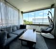 • Modern 4 story building, large glass windows, multiple balconies with tables and chairs, solar panels on the roof