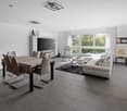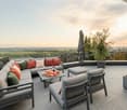 • large terrace, large glass windows, view of countryside, modern seating