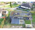 • Aerial view of a construction site, foundation and concrete base for the building, building foundation underway, with a crane on site, construction vehicles, and surrounding properties