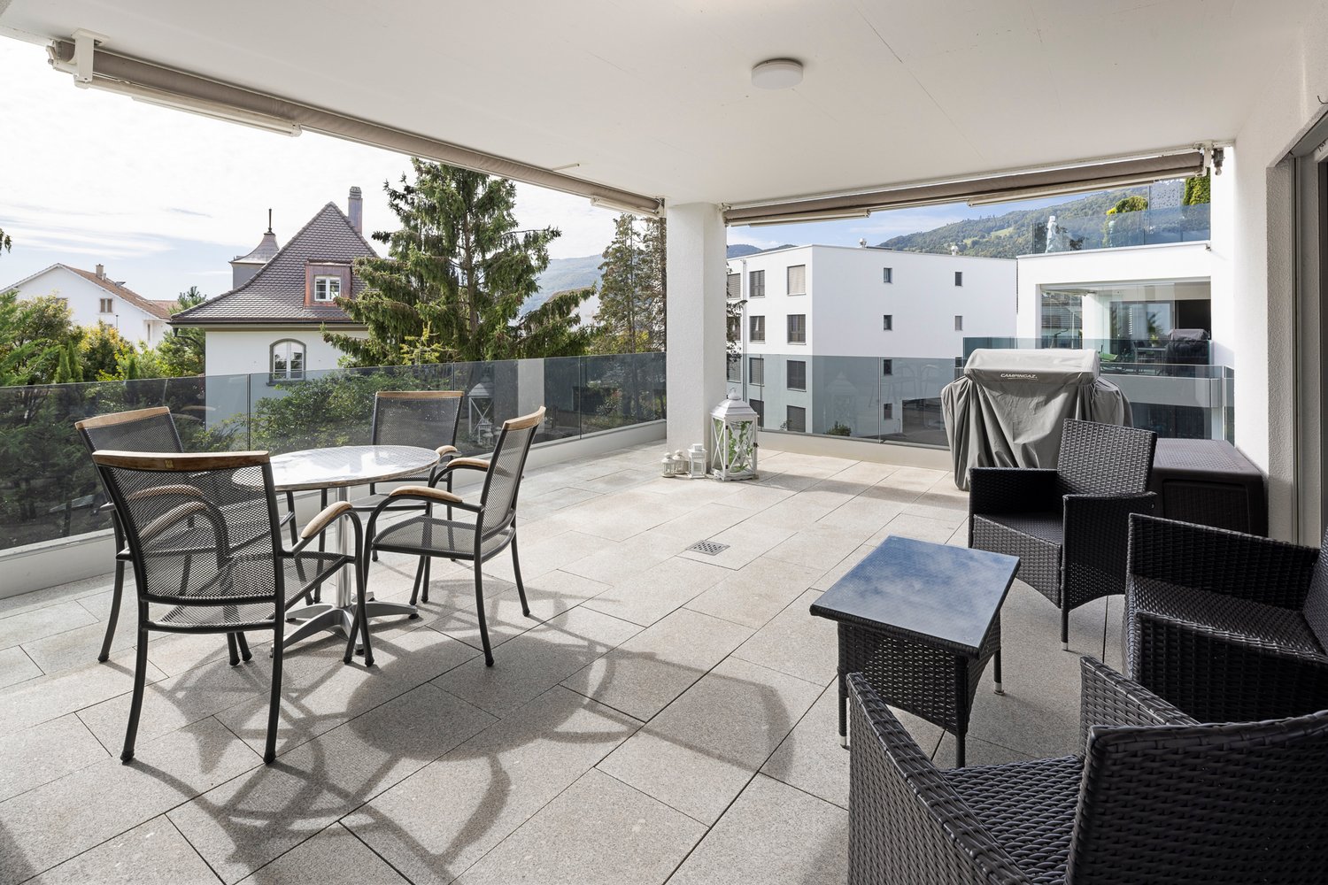 • covered terrace, sofa, chairs, round table, glass doors, balcony, tiled floor, plants