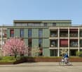 • Modern residential building with a balcony, surrounded by lush greenery, solar panels on the roofs