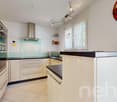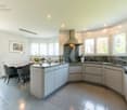 • modern kitchen, large kitchen island, granite countertops, wooden beams, large windows, balcony, green view