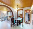 • kitchen with sink, cupboards, and dining area with table and chairs