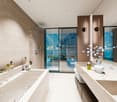 • Modern bathroom, walk-in shower, white ceramic tiles, wooden vanity, round mirror, large window, green plant, modern toilet, glass door