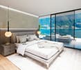 • modern bedroom with bed, white furniture, gray floor, window with view of mountains