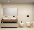 • Modern bathroom with glass shower, toilet, white basin, tiled walls, large mirror