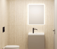 • Modern bathroom with white fixtures, square sink, white tiles, rectangular mirror, and wooden cabinetry.
