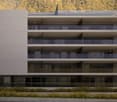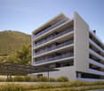 • Modern multi-story apartment building with balconies overlooking a lush, green landscape. The building has a curved design with large windows and a terrace on the upper floors surrounded by plants and greenery.