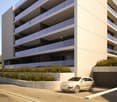 • Modern multi-story apartment building with balconies, green roof, and parking spaces in front