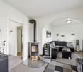 • wooden floor, open kitchen, large windows, dining table, comfortable seating