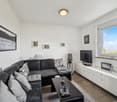 • Modern living room, white walls, wooden floor, glass doors, large windows, indoor plants, wooden table, comfortable seating, TV and media cabinet