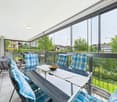 • Furnished balcony with table, chairs, and plants, featuring modern decor and a glass wall.