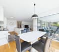 • Spacious open-plan living area with a kitchen, dining table, and access to a balcony or terrace. The room features large windows, white walls, hardwood floors, and modern furniture including a wooden dining table, blue upholstered chairs, and a kitchen is