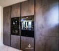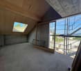 • modern kitchen, large kitchen island, granite countertops, wooden beams, large windows, balcony, green view