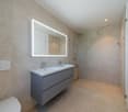 • modern bathroom, vanity with two drawers, integrated sink, mirror with LED lighting, white tiles, toilet