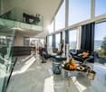 • balcony, coffee table, couches, swing chair, plant, panoramic glass walls, distant mountain range